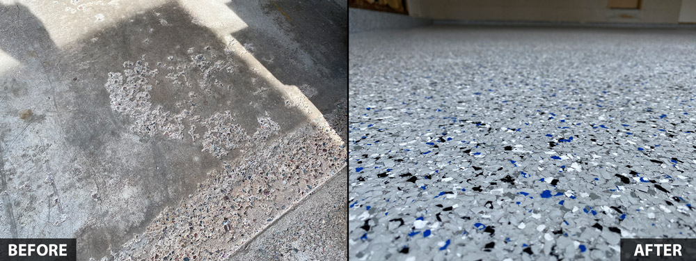 This flooring can be strengthened with UV-resistant layers of urethane. The life expectancy depends significantly on the quality and application. It can withstand the pressure of moving vehicles and reject chemicals and liquids that would otherwise destroy garage flooring.